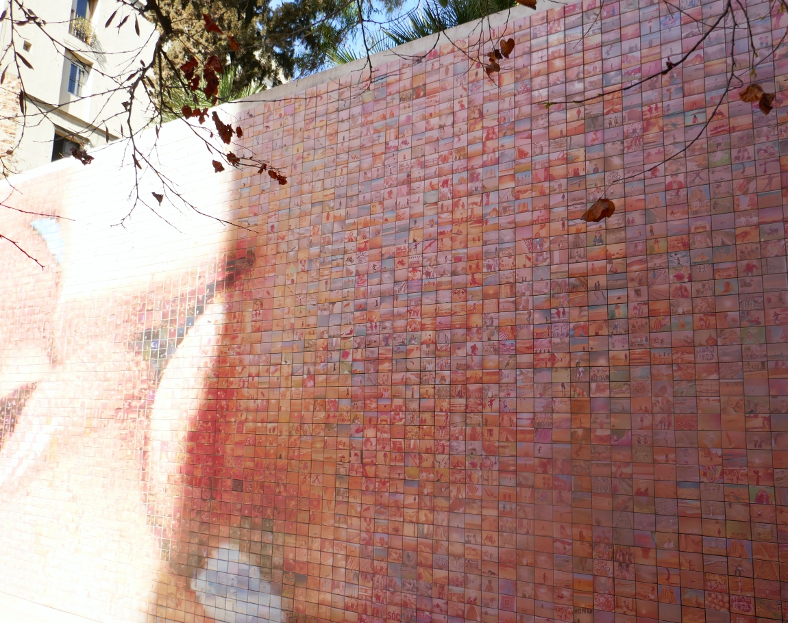 There was a laneway further on from the Aqueduct arches that we strolled through and found ourselves at another wall that appeared to be covered with small red/pink mosaic tiles. It seemed an attractive tiled wall until we got up close and discovered that each tile held a different image of folk going about their daily business. It is called the ‘Kiss Mural’. The artist asked local residents via the newspaper to send him photos representing a “moment of Freedom”. It was installed in 2014 as part of the celebrations commemorating the fall of Barcelona during the War of Spanish Succession. (1701-1715).