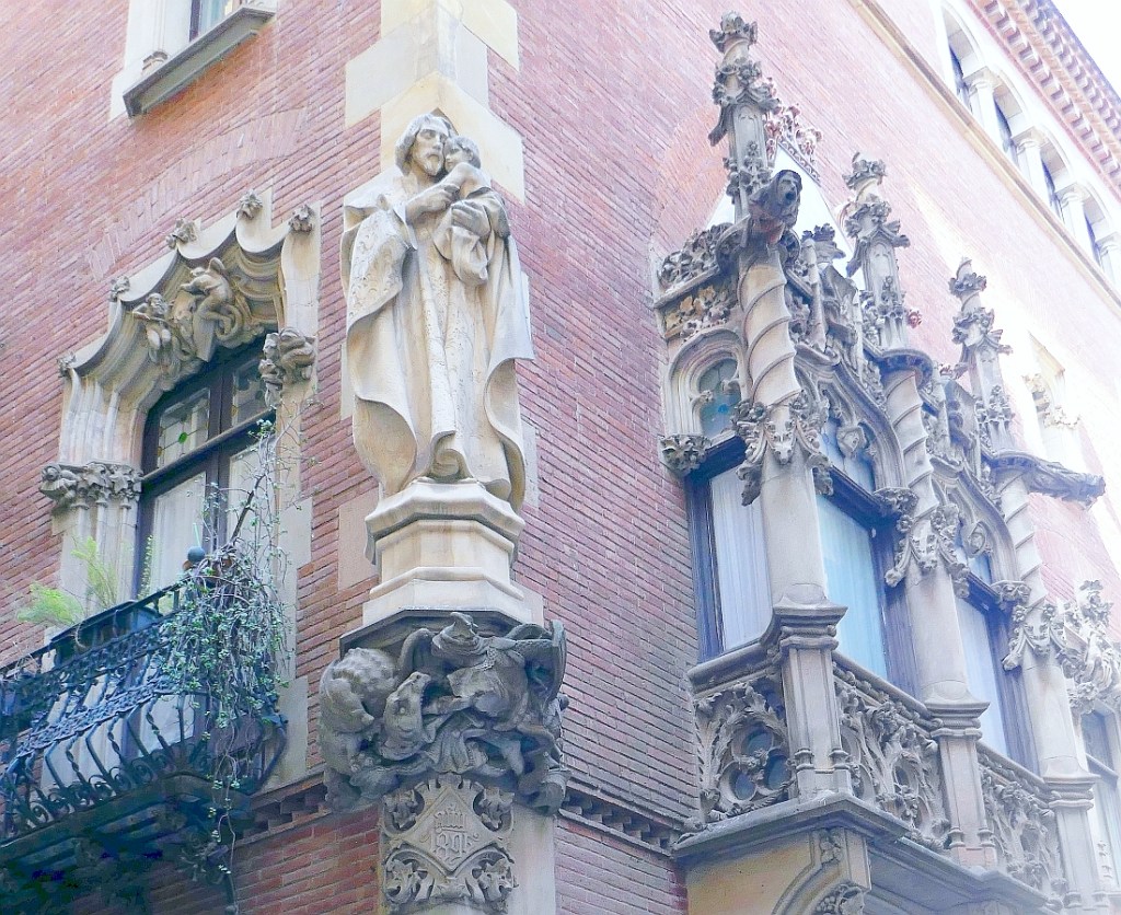 After passing under El Pont del Bisbe without incident, we came to the Church of St Severo (doorway, left below) whose external walls were adorned with a series of sculptures and mosaics. This church is not far from the Cathedral and belongs to the Chapter of the Cathedral. Construction of this church began in 1699.