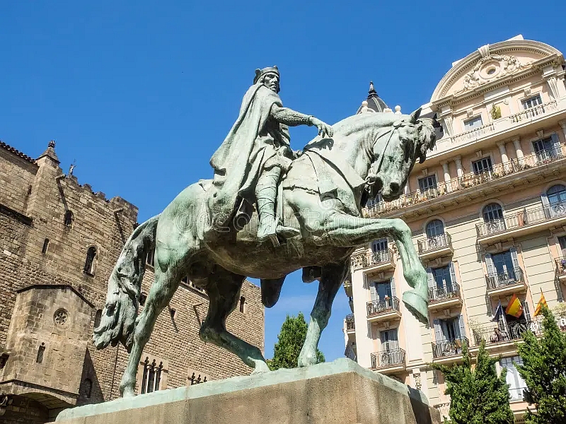 From the Cathedral precinct we headed through to the Placa de Ramon Berenguer el Gran. Here we found a very pleasant open-air restaurant with views over the square where we could rest our feet and have some lunch. The equestrian statue of Ramon Berenguer was not far from our table and thus ensued a controversial dialogue about the symbolism of the design of the front legs of the horse. It was declared by one of our companions that if the horse had both front legs in the air, the rider died in battle; if only one leg up, the rider was only wounded…etc, etc. Alas for this carefully designed theory about equestrian statues, it is a well-crafted urban legend.