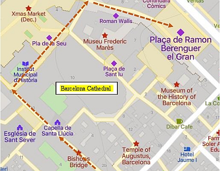 On our second day in Barcelona, I was up early to go for a walk around the area near our hotel. I found myself in Place del Vuit de Marc Square where I noticed two things that caught my attention. One appeared to be a Day Care Centre for pre-school age children with all the swings and roundabouts associated with their playground. The other was a large group of early-rising tourists who appeared to be finding interest in staring at the blank wall of a building that stood next door to the Day Care centre. I assumed it must have been of some historical interest so I decided to return with my small group of companions and check it out after breakfast. On our return later, we realised that what the early tourist group was looking at were the remnants of archways in the stone wall of the building (left below). They were the remains of the Roman Aqueduct that passed through this square and originally continued on to connect with Porta del Bisbe in the Cathedral Square. This almost 2000 year old memento of the Romans has survived due to some industrious folk deciding that it would make a better wall than anything they could produce