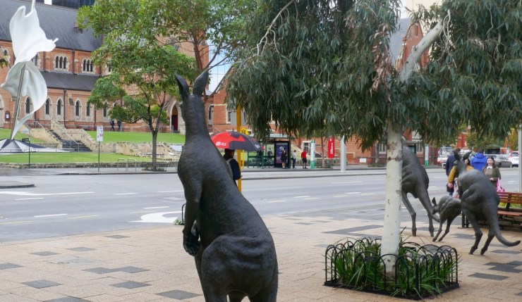 Along the footpath of St George Terrace you could be forgiven for thinking that a mob of kangaroos had escaped into the inner city and taken over. One of these large kangaroos was gazing across the road, no doubt startled by the sight of the lance Escalon. One version of the reason behind this series of sculptures (1997) is that it is a celebration of the ‘Kangaroo’, “they bound through this highly structured modern urban space, like shadows from an ancient past, flashing across the inner eye; creating a startling visual counterpoint to their surroundings and an instant reminder that these magnificent creatures were migrating for millions of years through this area from the Swan River foreshore, up through the chain of lakes upon which the City was built less than 200 years ago” (Visit Perth Walking Guide). Another suggestion is that they represent the totem of “the Wadjuk Noongar as yonga or male kangaroo people.”