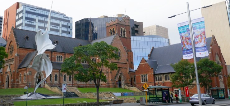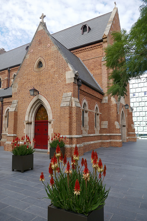 Our first destination, St George’s Cathedral, could be reached by simply walking out the front door of our hotel. As would be expected, there were a couple of Anglican Churches built in Perth before this cathedral was started in 1879 and finished and opened in 1888. In the image below to the right of the cathedral is the Burt memorial Hall which was built by the first Chief Justice of Western Australia when his sons were killed in WW1. A much later addition to this ecclesiastical landscape is the huge white lance and pennant that stands on the corner of the site. It is called Ascalon, the legendary lance of St George who used it to slay the Dragon. It represents the triumph of good over evil and was created for this site in 2018.