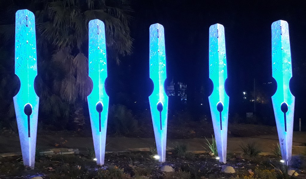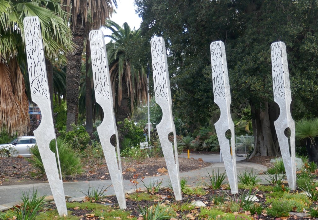 It was only a short walk back up the hill on Barracks St past the Supreme Court Gardens to our hotel. On the way, I noticed an art piece in the gardens that appeared to be just a series of old fashioned writing pen ‘nibs’ as seen in the image below left. On the Perth day when we went down river to check out Rottnest Island, we were late coming home with the same walk up the hill in the dark. The art work that I had noted previously obviously came into its own at night!