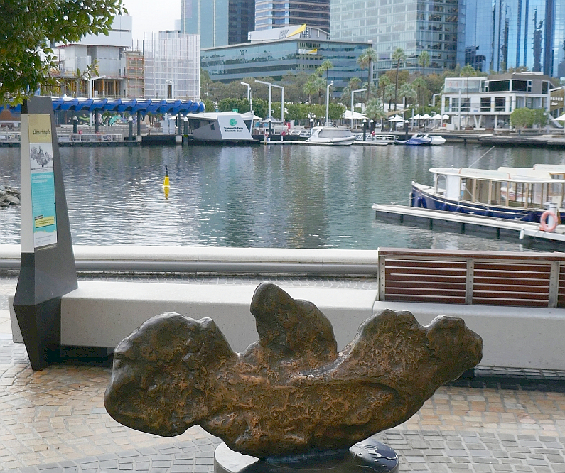Our trail took us along in front of the ferry terminal jetties to the edge of Elizabeth Quay, a small bay that was the focus of huge building developments when we visited in 2021. However, the first thing I noticed was a replica of the largest gold nugget ever discovered in Western Australia. Spotting it immediately took me back to my primary school days where I remembered we did a study of the history of the discovery of Gold in Australia. This nugget was called the ‘Golden Eagle’ and was dug up near Coolgardie WA in 1931. I am sure it is considered a symbol of the ever-expanding mining boom that was the history of Western Australia from then on.