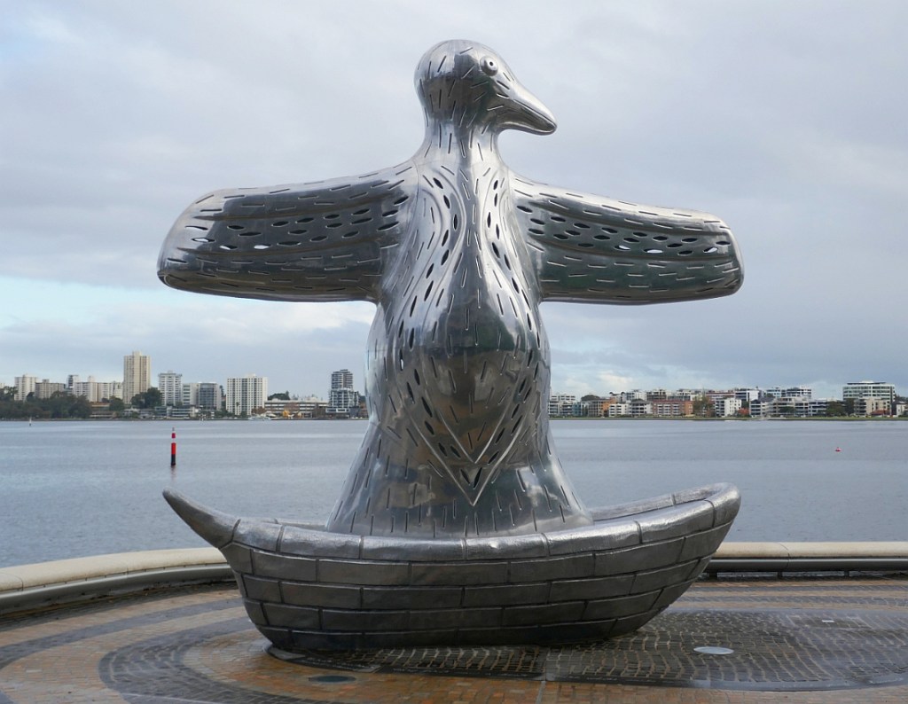 On the other side of the bridge, its arms stretched out in welcome, is a sculpture titled ‘First Contact’, welcoming visitors to Elizabeth Quay. The cast, aluminium artwork is by Laurel Nannup and “represents the arrival of European settler ships to Perth, whom the local Nyoongar people believed to be their past ancestors returning from the sea.”
