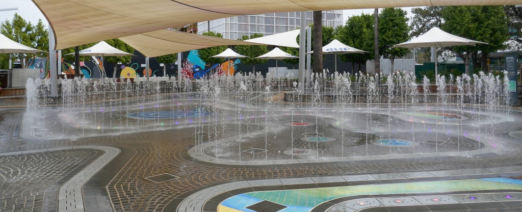As part of finishing off our walk around the facilities of Elizabeth Quay, we decided we would go and have a look at the Elizabeth Quay Train Station that was not far around the corner from the Quay. On the way we were able to take in ‘BHP Water Park’ that was built in the area on the left hand side of the Quay precinct. It is designed to be an “interactive water feature that uses jets and lighting to create fun and exciting water choreography.” On the bottom of this water park is a mosaic that represents Dreaming story of the creation of the Milky Way.