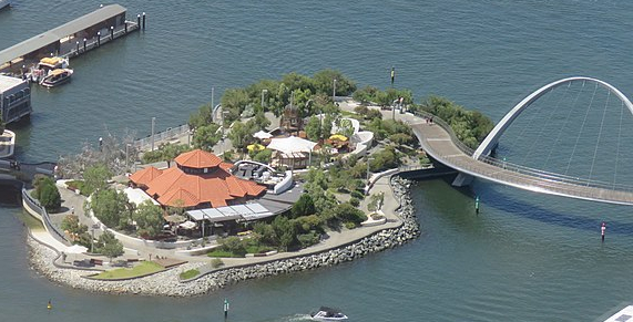 To continue our walk around Elizabeth Quay, we left ‘The Island’ over the extraordinary curved Elizabeth Quay Pedestrian and Cyclist Bridge that weaved its way across to the next bank; a bridge sufficiently high to allow boats under it into the quay. I liked the description on the builders’ website that described it as follows… “The balustrade design follows the bridge deck curves in plan and also leans in and out vertically, twisting like a ribbon along the length of the bridge.”