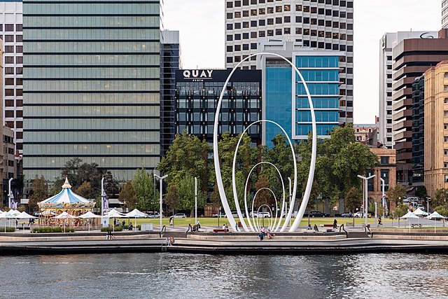 The redevelopment plan for Elizabeth Quay certainly contains plenty of high-rise buildings and two of them will make up the backdrop of the left-hand side of the quay as the visitor looks towards the City shoreline where another public art-piece, ‘Spanda’ stands. It is a series of expanding elliptical orbits, its ‘meaning’ explained by the artist Christian de Vietri here. “Spanda is a Sanskrit word that means ‘divine vibration’. The term is used to describe how consciousness moves in waves of contraction and expansion. The sculpture gives form to this primordial energy. My intention in making this sculpture is to express and facilitate oneness of the individual with the universal.”