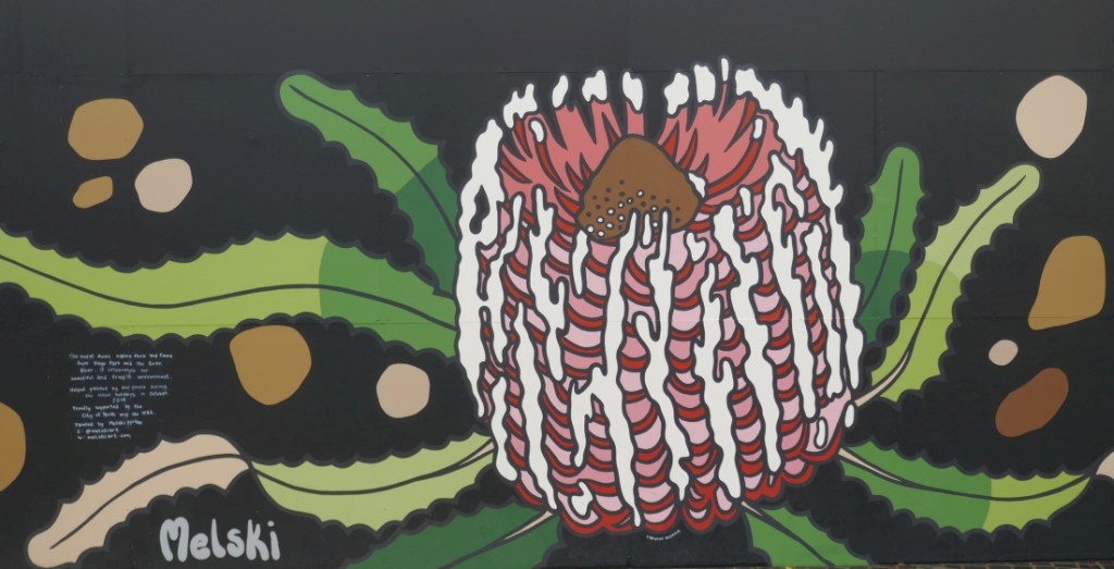 Our walk towards a closer inspection of ‘Spanda’ took us past some gorgeous images of Western Australian flora and fauna. I could not decided whether they were permanent displays or coverings of the fences that surrounded the redevelopment sites.
