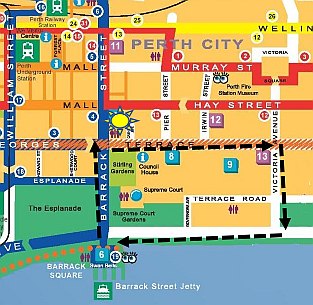 We devoted three nights to get to know the centre of Perth, capital City of Western Australia. After travelling around the state for a month, we decided to lash out and spend some luxury time in Como, The Treasury Hotel, right in the historical centre of Perth. The basic skeleton of the hotel were buildings that were originally Government offices constructed in the late 19th century. If our hotel was the ‘sun’ image on the map to the right, it was from here that we followed a trail that took us around some of the historic buildings of colonial Perth as well as the modern facilities and public art of the centre of 21st century Perth. If you need assistance, this process can be done by booking an organised tour with the Perth City Visitor Kiosk (Tues, Thurs, Sat) or going online (https://visitperth.com/en/getting-around/walking-tours) and downloading one or more of their excellent guided walks.