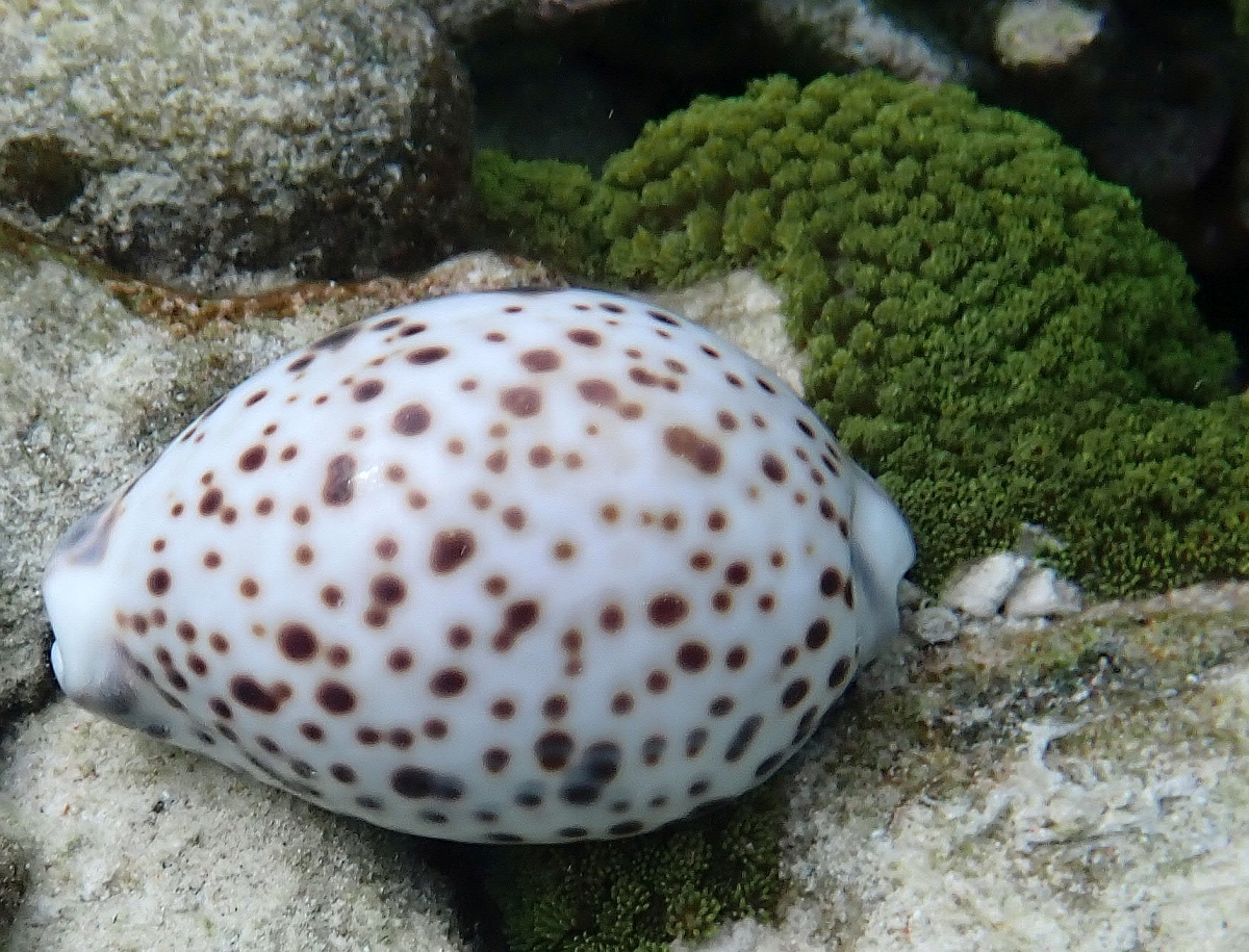 Another smaller attractive mollusc to be found slowly roaming the reef in the lagoon is the Cowrie (below left), a sea snail that eats by rasping its way along the coral eating the seaweed.