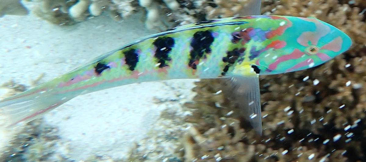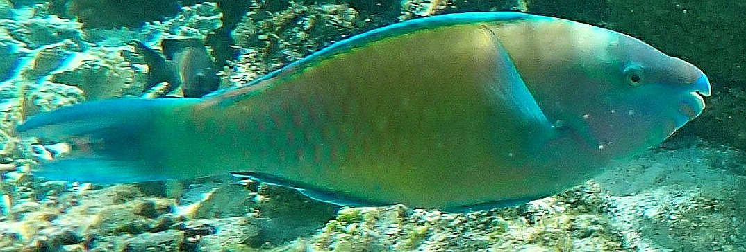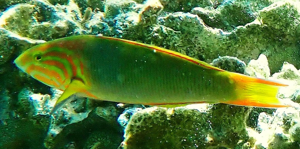 Normally the bigger fish species are more at home on the Reef Side of Lady Elliot Island but sometimes they are stray into the lagoon. The Parrotfish (right below) belongs to a large family of species; 95 species can be found in the Indian and pacific ocean. They are called parrot fish because they have numerous teeth which they use to rasp algae off the surface of corals. Some parrot fish have the curious ability to surround themselves with a mucous cocoon at night that gives them some protection, if only an early warning of a predator about to strike.