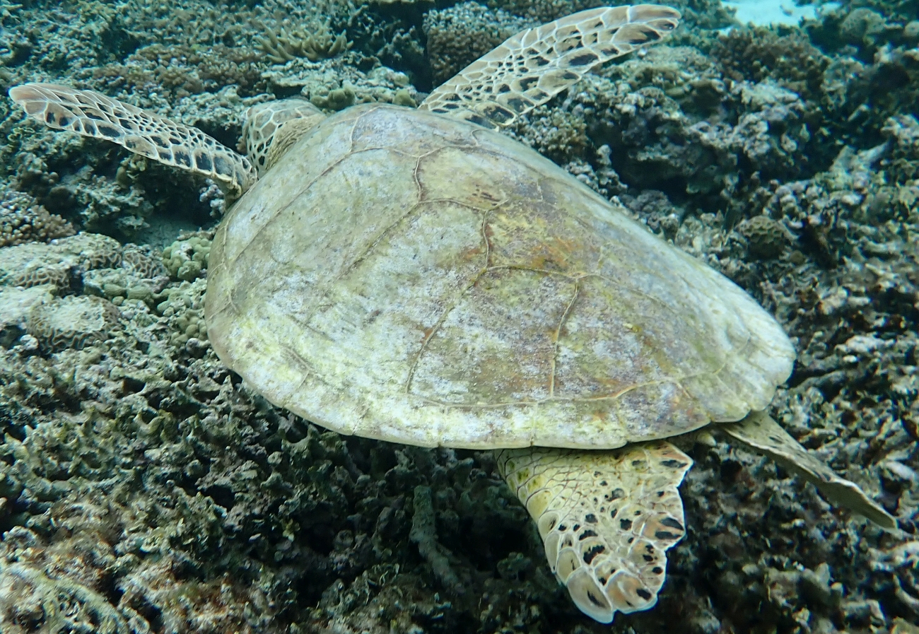 Perhaps the highlight of any time spent in the lagoon is when the snorkeller comes across a turtle. Luckily for us, the turtles ignore the inquisitive humans that circle it as they go about their business searching for food along the reef. It feeds on bottom dwelling invertebrates as well as sponges, coral, sea urchins, sea cucumbers etc.