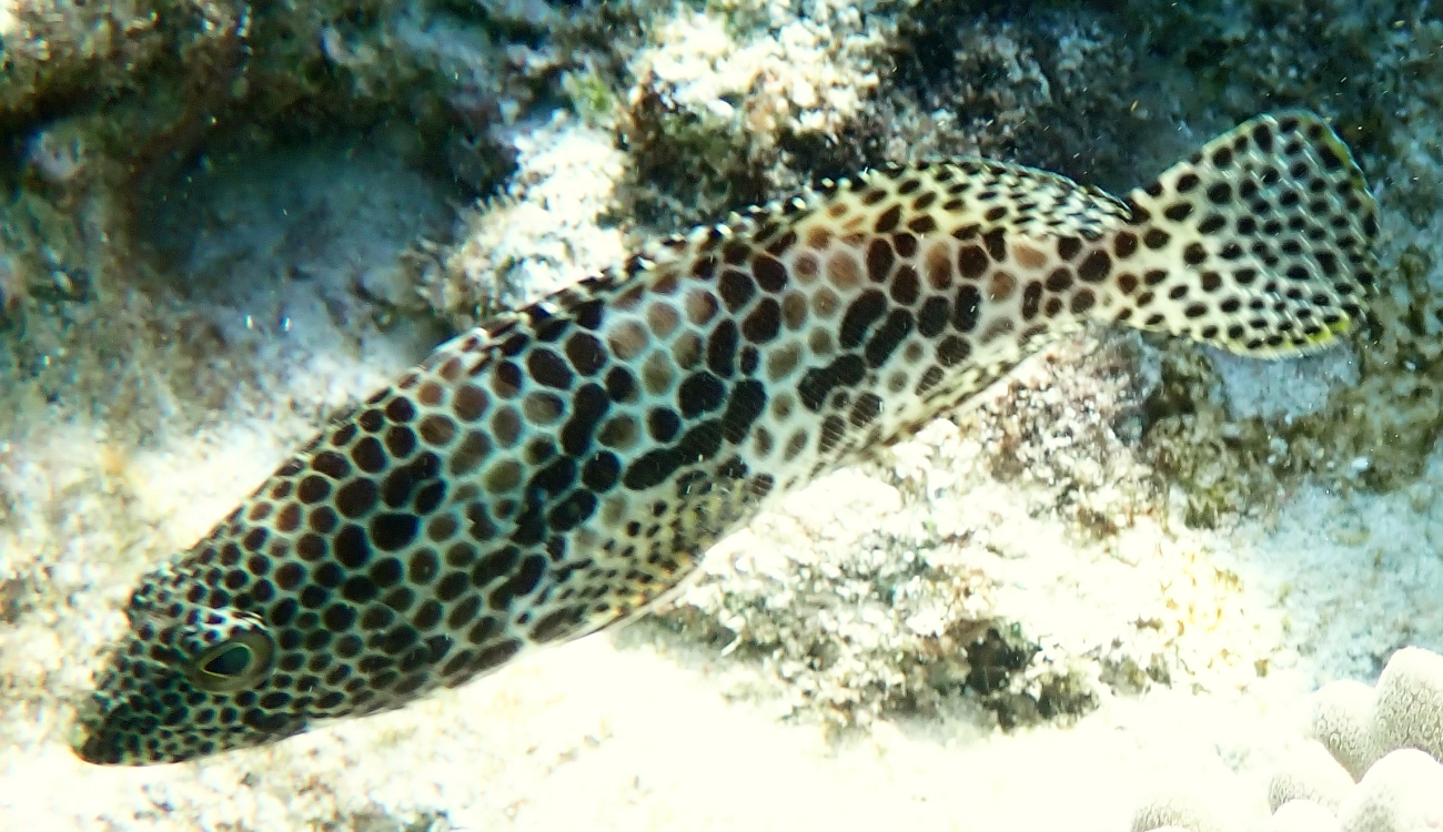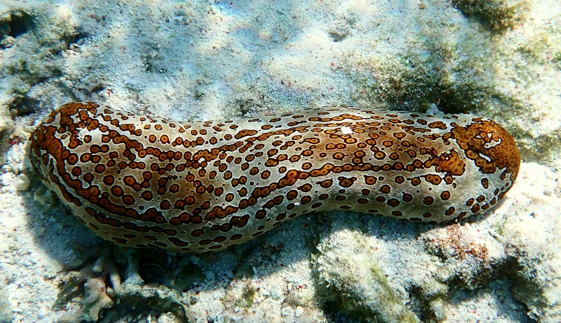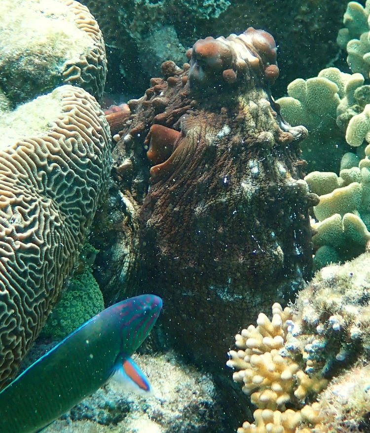 We were very excited on one of our days snorkeling in the lagoon when a group not far away called out to us with the cry of ‘OCTOPUS’! I had never encountered an octopus before but this one was Octopus Cyanea, an octopus that lives on the reef and usually its camouflage keeps it out of sight from inquisitive snorkelers. As part of its camouflage, it can change its skin colour to match the surface area it is moving over. When we spotted it, it was a deep maroon colour which is quite impressive for a creature that is sometimes called the Big Blue Octopus’. It dines on fish, crabs, shrimp, and molluscs.