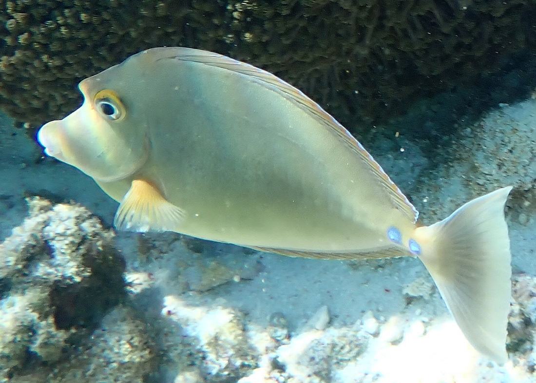 The Blue Spine Unicorn Fish (above left) is another large fish that I spotted prowling the sandy alleyways of the lagoon. It is a near shore fish feeding on algae from the coral. It is apparently an abundant fish throughout the Pacific and is a common food source for people on the Pacific Islands