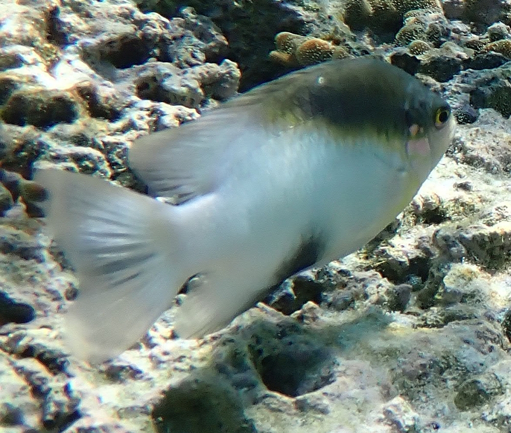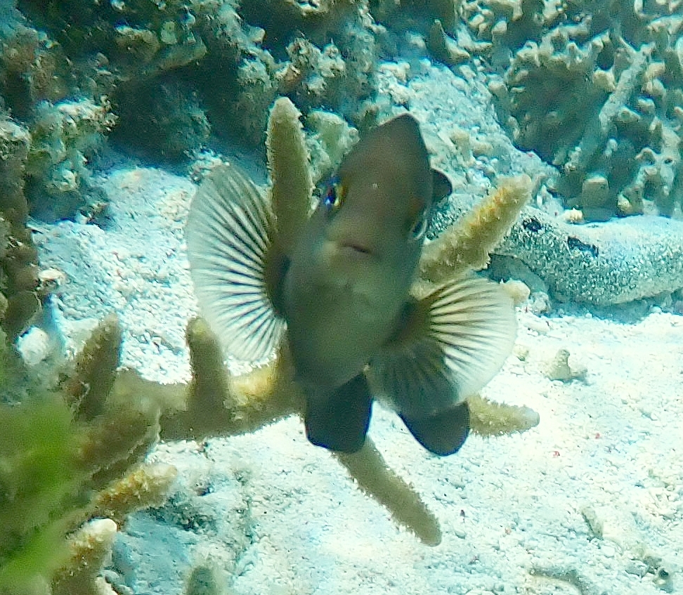 One of the first small fish you will notice when snorkelling in the lagoon is the Farmer Damselfish above. It is called a ‘Farmer’ fish quite deliberately as it farms a ‘brown carpet algae’ on staghorn coral, driving away other fish or sea urchins. It also attempts to drive away humans if they get too inquisitive about their ‘farm’. The photo on the right above is an example of the Farmer Damselfish darting at me as the camera came too close to its coral area.