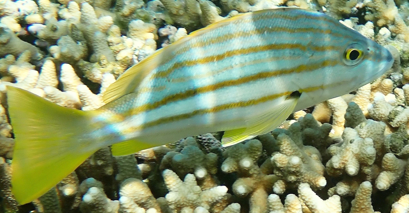 One less common fish that the lagoon snorkeler will come across is the Brown Marbled Grouper, seen below left. It is active mainly in the darker hours. It is a carnivorous fish and is an ambush feeder on smaller fish and crustaceans. It can live for around 40 years but has been listed as a vulnerable species due to overfishing by the ‘live food fish trade’. The Strippy Snapper was also not a particularly common sight in the lagoon (right, below). It is a native species of the western Pacific and Indian oceans