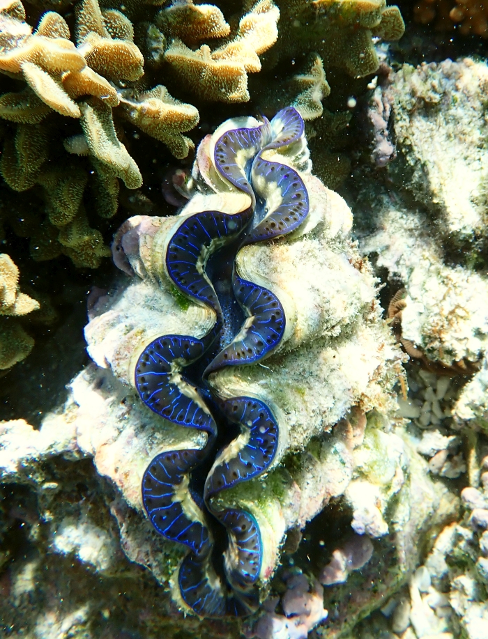 One of the beautiful sights for snorkellers in the lagoon is the number of giant clams that find themselves a home amongst the coral. I was amazed at the colours and ‘decorations’ of the external ‘lips’ which close up if the snorkeller gets too close. It is a bivalve mollusc, a filter feeder taking in plankton. They have algae inside them in a symbiotic relationship with the clam; the algae produce waste products that also become a food source for the clam. Unfortunately, the giant clam is on the list of vulnerable species due to the Aquarium trade.