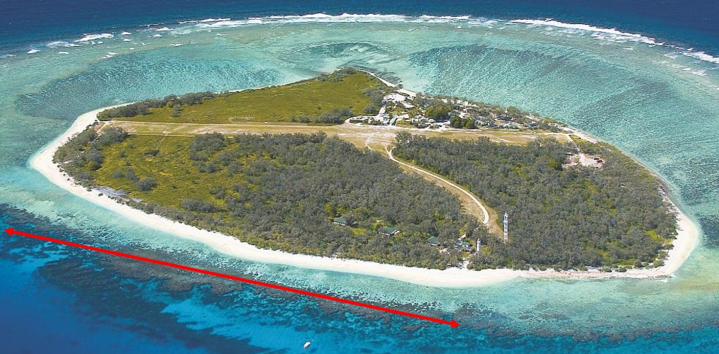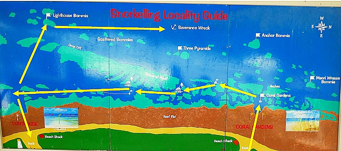 One of the issues that must be checked out before snorkelling along the reef side of the island is to find out first the direction the current is travelling. It is an important step at the start of each day to check out the water conditions (high tide, currents) on the whiteboard at the dive shop. This will then determine whether you start your exploration of the reef from the airport runway end or the lighthouse end. To make snorkelling easier for all swimming levels of visitors, a very long rope has been connected to anchored buoys along the reef so swimmers who need a rest or folk who like more security than others can snorkel with one hand close to the ‘safety rope’. The map below shows some of the exploration paths on the reef side of the island.