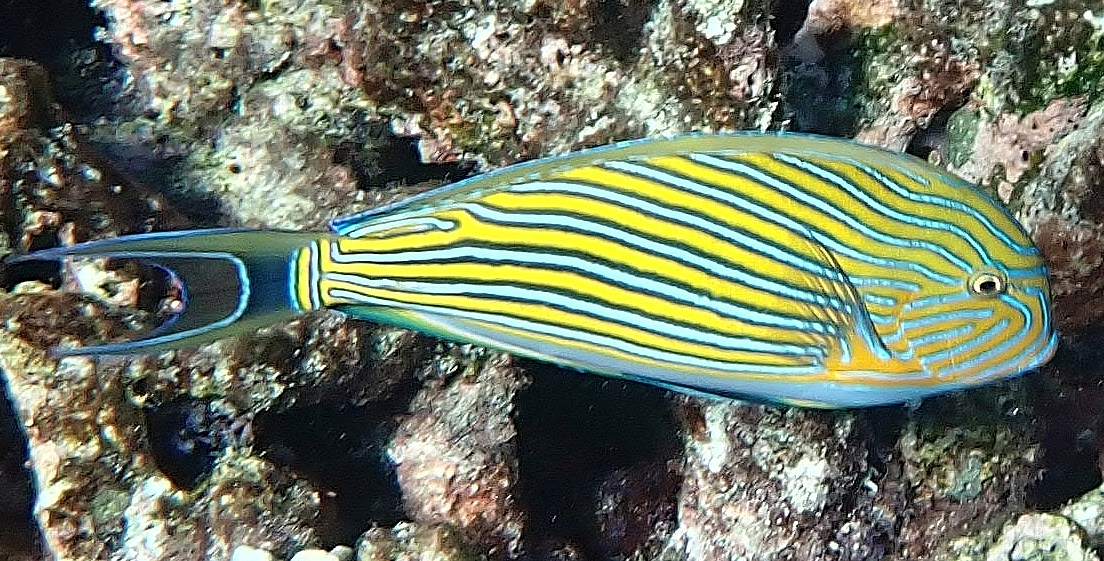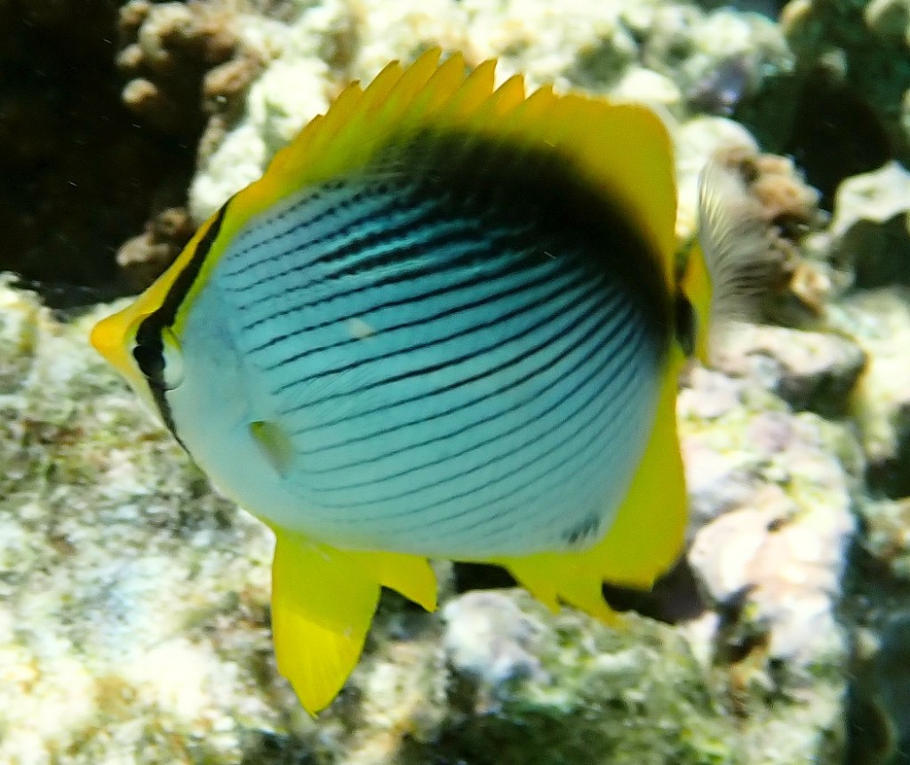 The deeper you go in the water, the spectrum of colours from the sunlight disappears. Red is the first colour filtered out and then yellows turn to grey and greens slowly turn brown. Blue is the colour that travels farthest. Scuba divers down at 300 metres need lights to find their way around. Based on the colour shown in the above images, a colour scientist might be able to guess how deep the fish are! The Lined Butterflyfish on the left is an easy fish to spot, not just because it is yellow but it also seems to swim higher up in the water from the top of the reef.