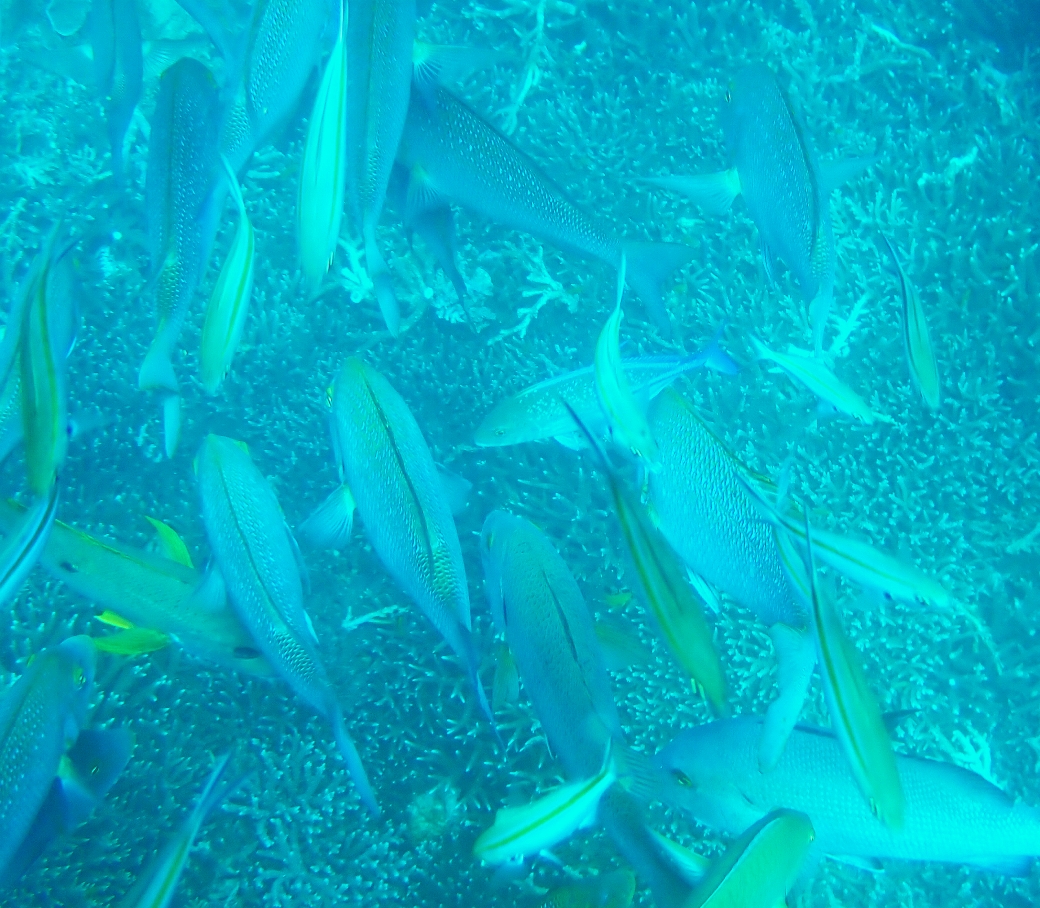 There is so much to see snorkelling over the offshore reef at Lady Elliot. One of the problems with this abundance of amazing marine sights is the irresistible temptation for those carrying a waterproof camera to continuously take photos. It is probably preferrable just to relax and enjoy the journey rather then worry about recording it. The problem with the reef side of the island is that for much of the high-tide period, the water is quite deep around the coral reef so those beautiful fish you see at the bottom lose much of their colour (eg. Photo below left).