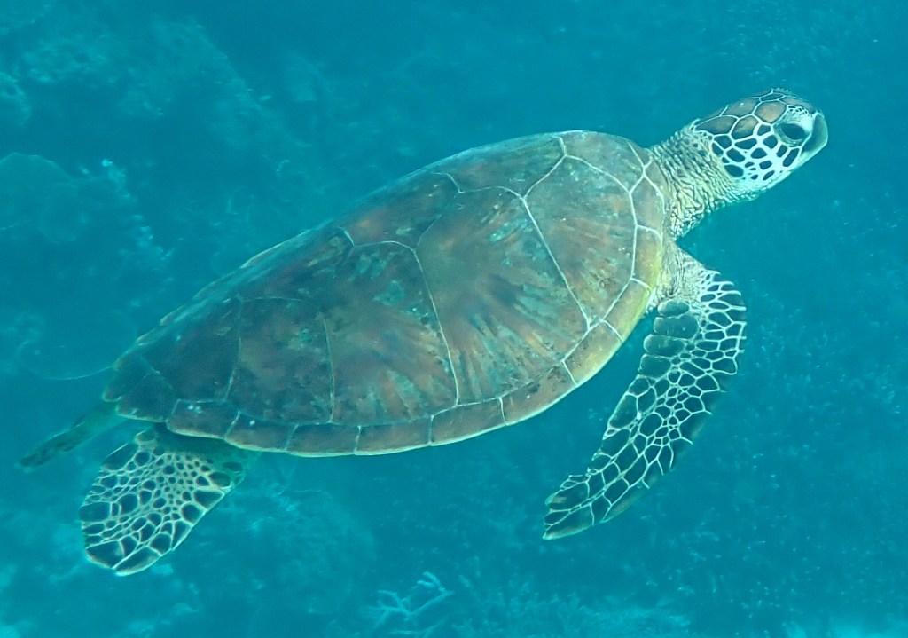 There are plenty of Turtles to see on the reef side of the Island. The turtle in the image below kindly swam well above the reef so we were able to see its swimming style in open water with only some loss of colour on its shell and body.