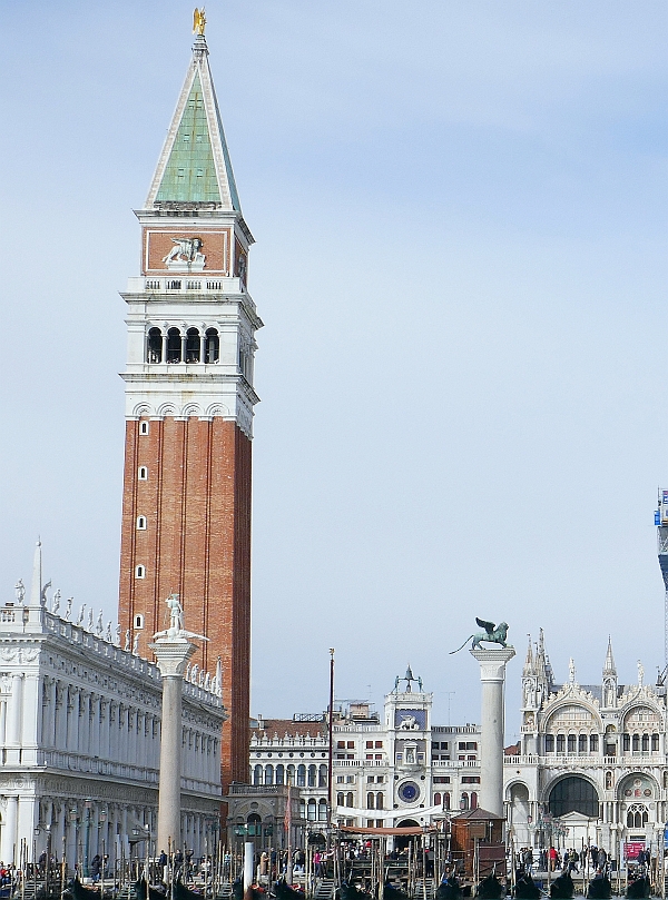 Not far back from the Grand Canal and the two pillars is the Campanile or bell-tower. Initially the bell-tower was to be part of a series of defensive walls on the edge of St Mark’s square back in the tenth century. After the initial construction, additions were made to it in the coming centuries. These earlier structures were made from wood and copper plates but as it was a target for lightning (and bonfires!), it regularly suffered from fire hazards. It was even damaged by an earthquake in 1511.