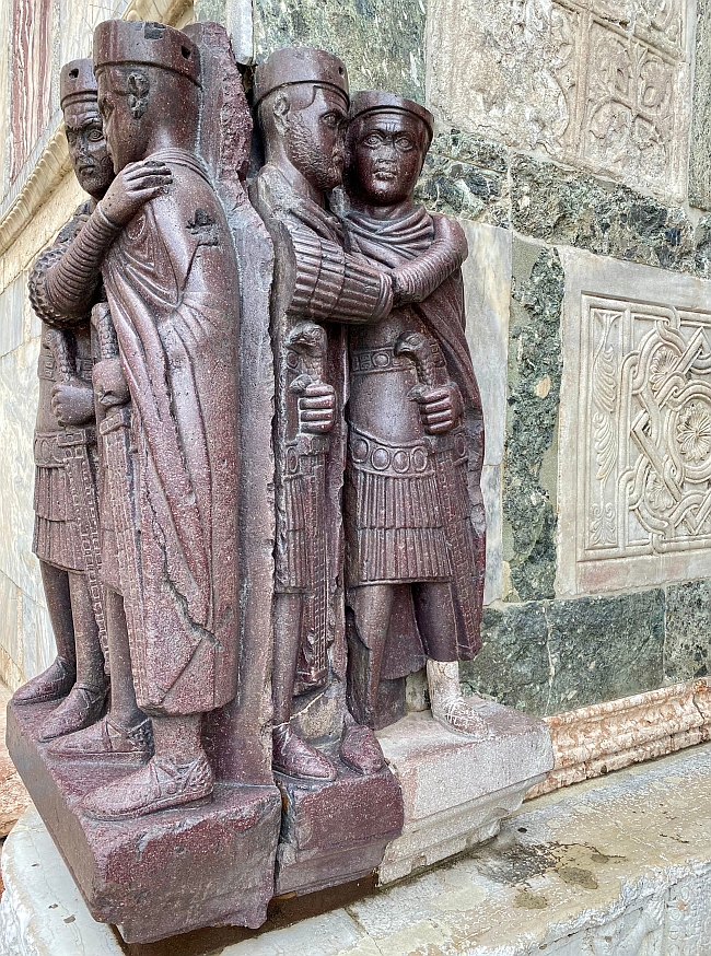 The image to the right is the central archway of the façade of the Basilica and apart from the many sculptures holds two key images. One is the golden lion of Venice that takes pride of place at the top, centre of the archway. The second grand image is of the four horses of St Mark that stand at the edge of the central archway. These are not just any horse sculptures. Before their time in Venice, they were known as the Horses of the Hippodrome of Constantinople. If you visit the hippodrome in Istanbul today, you will see the plinths that these horses once stood upon until this eastern Roman city was looted as part of the Fourth Crusade in 1204. However it is believed these horses date from the 2nd or 3rd century CE and are of classical Greek origin. They represent an amazing time capsule of the last two millennia.