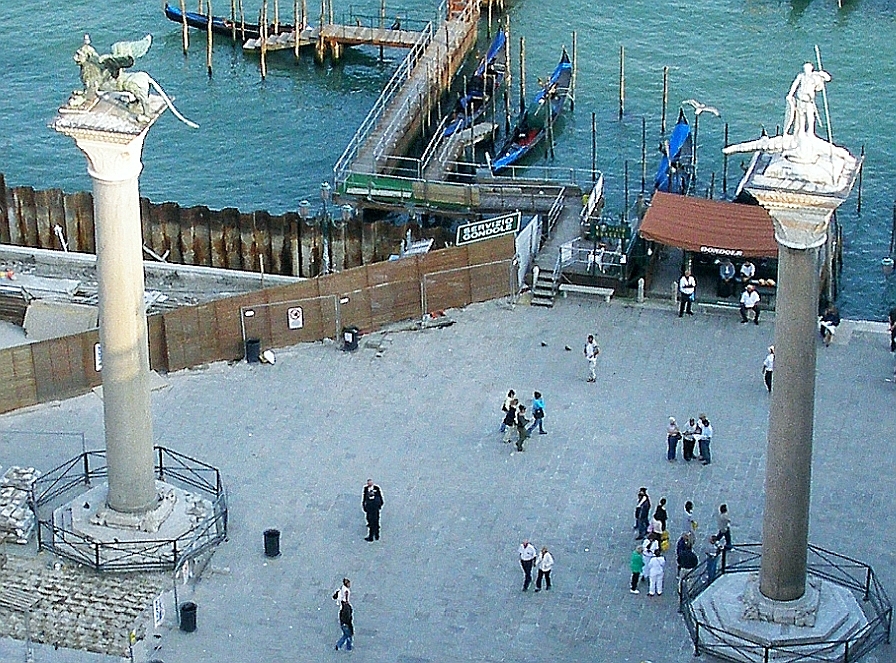 Like so much of early Venetian history, the arrival date of the columns is uncertain, probably sometime around the 11/12th centuries. They may have been brought from Constantinople or Tyre in Lebanon and because of their weight, they were left lying on the quay for many years. Bringing these columns to Venice by sea was a major production, somewhat like the process that the Romans had to develop to bring all the looted Egyptian obelisks to their Roman cities.