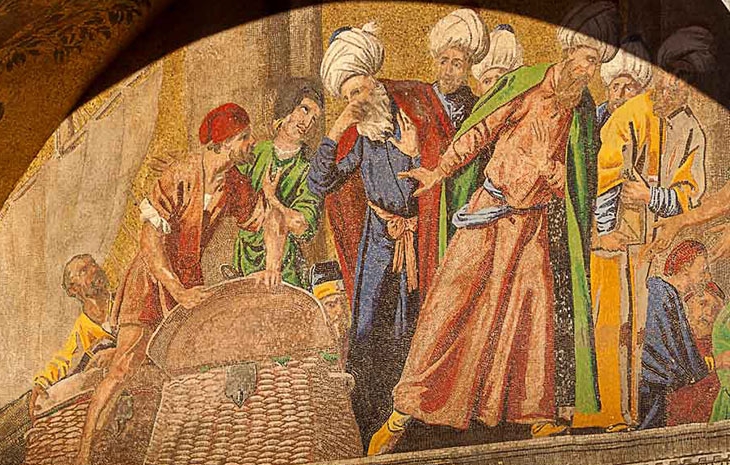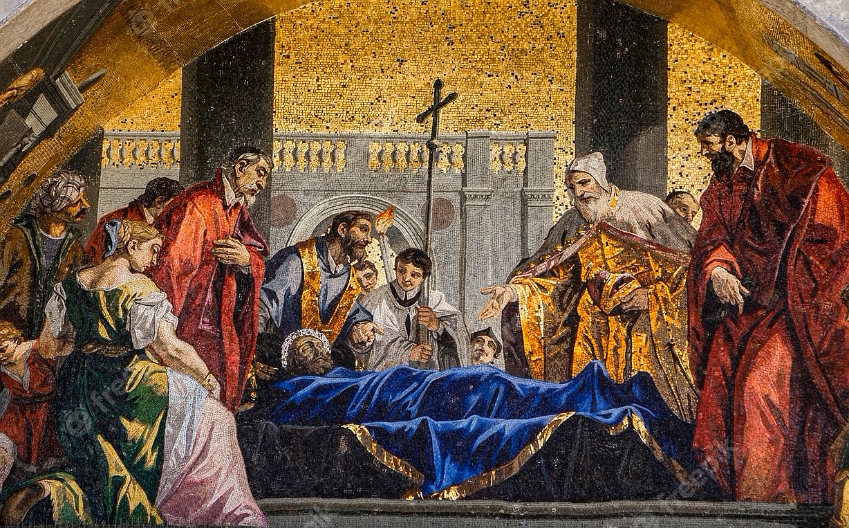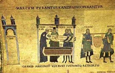 The story of the construction of a church on this site is based around the story of the theft of the body of St Mark the evangelist from a church in Alexandria, Egypt. A short version of the story is that a pair of merchants stole the body of St Mark, hid it in a weaved basket underneath pig meat and shipped it from Alexandria to Venice. The current basilica is the third version of the church built on this site and today the casket of St Mark is kept under the high altar. In the first archways of the basilica, the curious story of the theft of St Mark’s, thousand year old body is presented in mosaic form and its arrival in Venice is also presented here. One of the ageing clerics appears to be holding his nose in the image to the right below; presumably it is the pig meat that smells, not the ancient body. The image above right is almost a cartoon version of the theft of St Mark and is to be found in the Chapel of Saint Clement inside the Basilica.