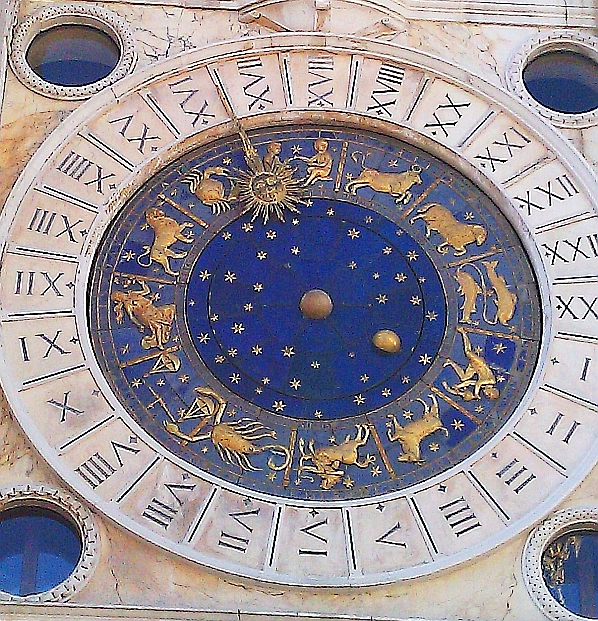 At the very top of the tower can be seen a bell and two figires who strike the gong on the hour. The next stage down is the winged lion of St Mark in front of an open book. Originally there was a statue of one of the Doges kneeling before the lion to the right. The invading French army, as was their want, decided to remove the statue of the Doge as it was a key symbol of the old regime of Venice. (It hasn’t been restored!) The next stage down shows the virgin and child plus two panels revealing the current time. Above the archway is the final stage of the tower showing the great clock face. Inside the marble circle are the 24 hours of the day and in a further inner circle there are the signs of the Zodiac. The whole assembly of the tower is an amazingly complex piece of engineering.