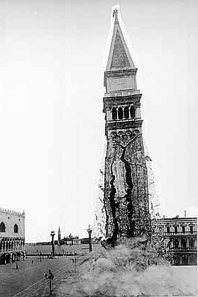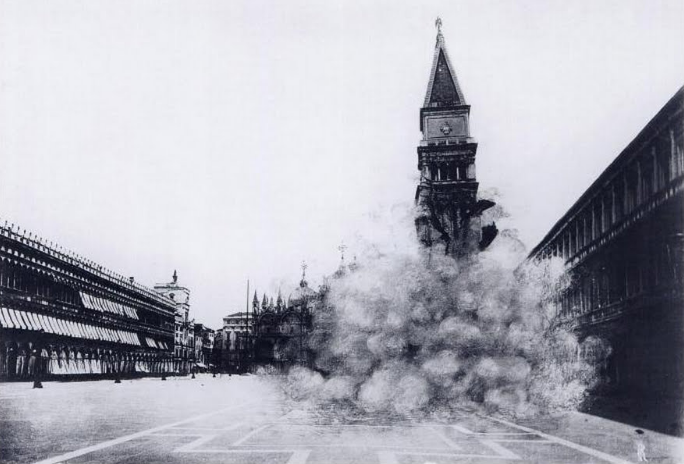 The wait for a complete reconstruction of this belfry/tower had to wait until 1902. The foundations of the tower had been deteriorating for many years and by 1902 there were signs that all was not well with the tower that was considered the oldest of its type surviving in the world. On Monday 14th July the square was evacuated as stones began to fall after 9.00am. At 9.53 the tower collapsed so I am sure photos were taken by on the spot reporters, alert to a major local story about to occur at the end of St Mark’s Piazzetta. The tower was completely rebuilt and was inaugurated in March 1912.