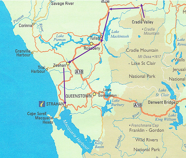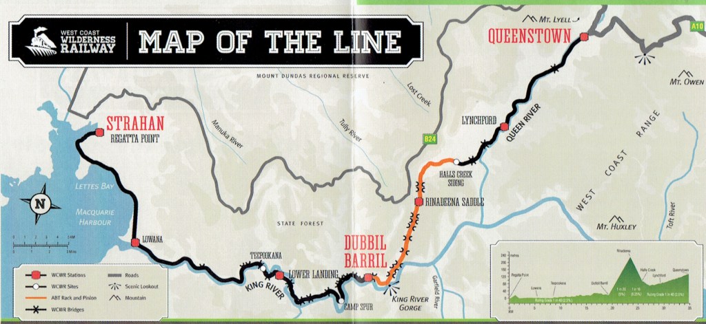 We decided it would be great idea to do a half day journey but time was not on our side. On the map to the right can be seen the half way point in the line called Dubbil Barril. You can do half-day return journeys from either Strahan or Queenstown and turn around at Dubbil Barril or a full 9 hour tour from Strahan to Queenstown and back.