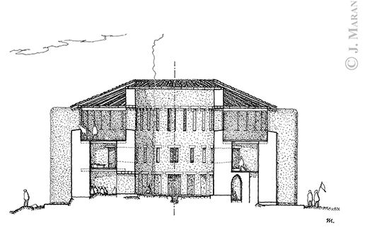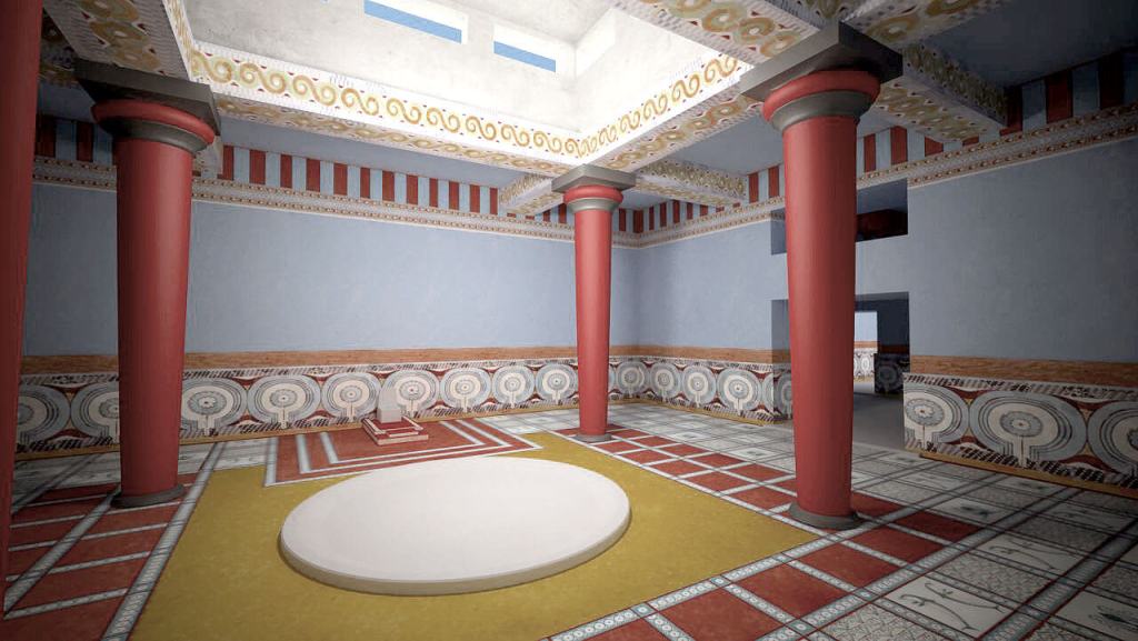 The recreation of the Megaron in the Tiryns palace below (courtesy ucadp.com) shows the similar layout that archaeologists found in Mycenae. It has the frescoed walls, the opening in the roof supported by four pillars and the hearth circle in the centre.