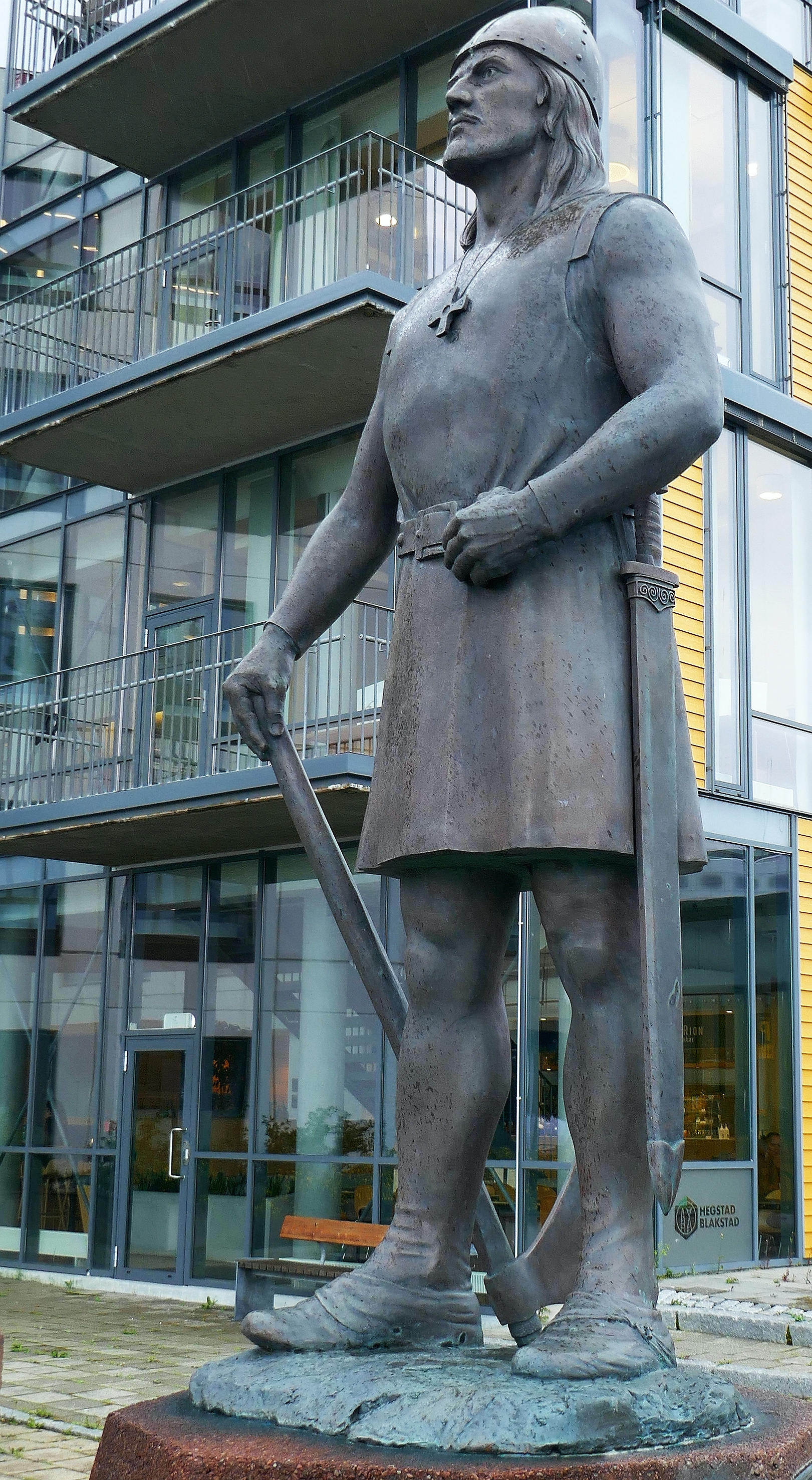 We left our Hurtigruten boat behind and rode for a short time along the docks area, stopping at a monument to Leiv Eiriksson, a replica of a statue erected in Seattle in 1962 as part of the World’s Fair in that city. Eiriksson’s journey to Vinland, (North America) in the year 1000CE has been known about since the 13th century as it was written into the sagas of the Norsemen. Independent confirmation of Vikings in Newfoundland has been precisely measured by scientists as occurring in 1021, around 1000 years ago; discarded sticks and tree trunks with clean edges were used in this process as the indigenous inhabitants did not have metal tools to cut wood.