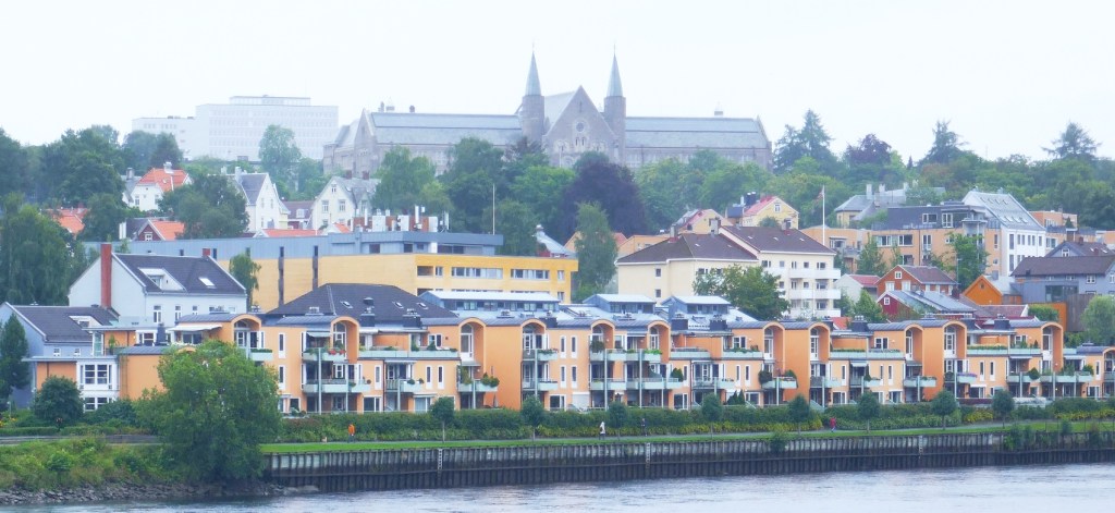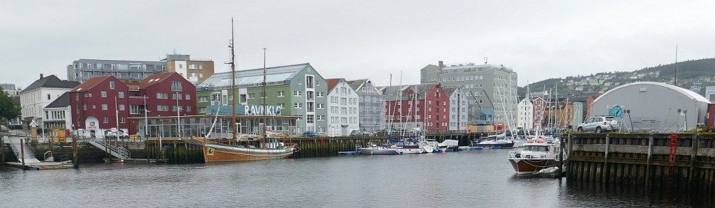 From the Old Town Bridge can be seen the University of Science and Technology on the western side of the Nidelva River. Our guide referred to it as the Hogworts of Trondheim. He was also very aware that our tour was running out of time so our ride back to our ship was a fairly swift one without much sightseeing. Despite little commentary, we were able to enjoy the views of the river, particularly of the tall colourful houses that stretched out over the water. It gave us ideas for sightseeing when we reeturned to this fascinating town in the near future.