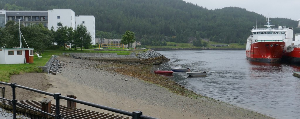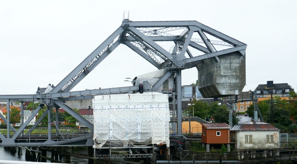 The Trondheim Canal we were riding beside had exits at both ends. The curious piece of engineering in the photo on the left (the Skanson Bridge) was designed by one Joseph Straus who among other things designed the Golden Gate Bridge in San Francisco. It is a railway bridge with a counterweight that is able to open the bridge to provide a means of enabling sailing boats to pass out this end of the canal. The bridge was opened in 1918 and in 2006 it received ‘architectural conservation’ being unique in Norway and one of the few left in the world.
