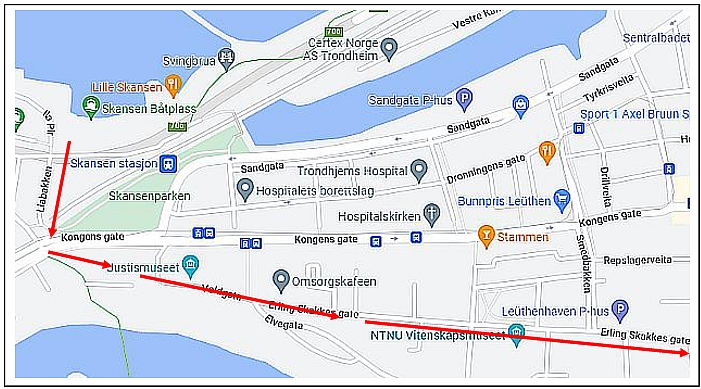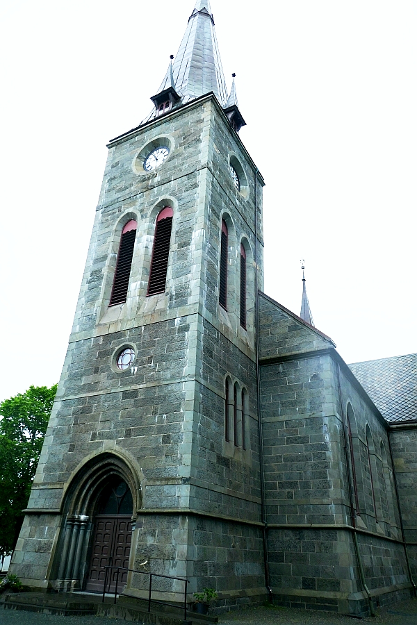 We left the fjord side of Trondheim and headed towards the river before turning left onto Kongens Gate where not far along we encountered the Llen Church. This grey-stone church was built in 1889. The distance between the fjord and the river here is only 250 metres.