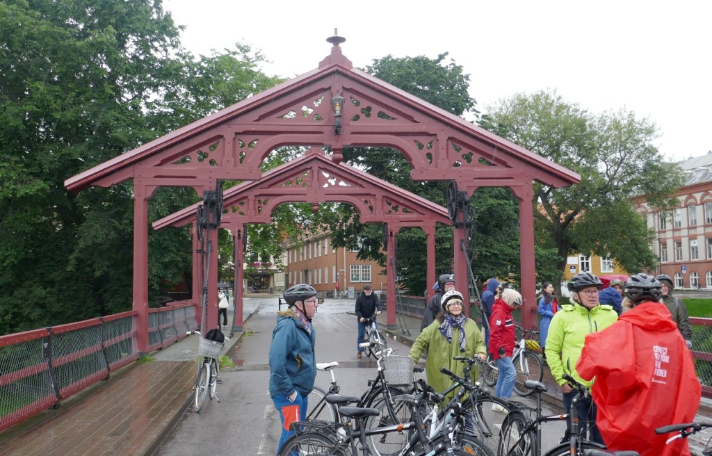 From Torvet we biked down to the river to inspect Gamle or Old Town Bridge. It had been built in 1681 as part of a reconstruction of Trondheim after a great fire of that year. There is a sad story about a waltz written about this bridge in the early 1940s by singer/composer Kristian Hoddo. He was a member of the Resistance Movement against the Nazi occupiers but was captured with 8 other fighters in November 1943 and executed.