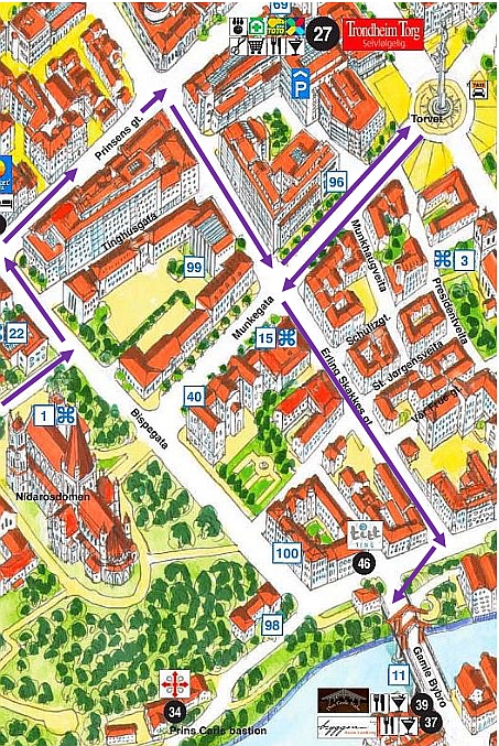 From our morning tea house, we rode to the central ‘piazza’ of Trondheim (Torvet). The main feature of this area was the tall pillar on which a statue of Olav Tryggvason stood, considered the founder of Trondheim. An extra feature of this column is that it stands on top of an obelisk, a cobblestone mosaic dating from 1930 which forms a huge sun dial.