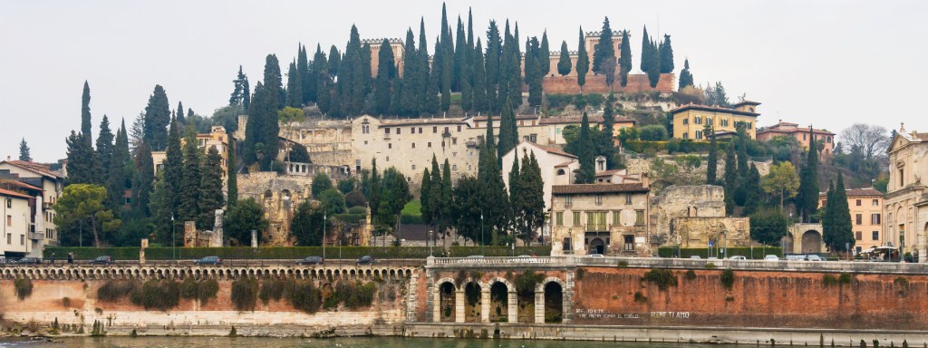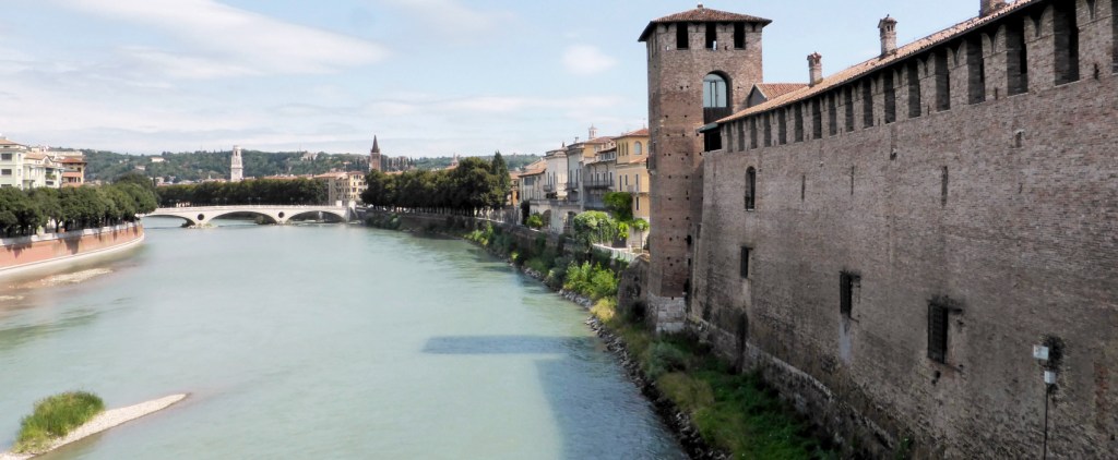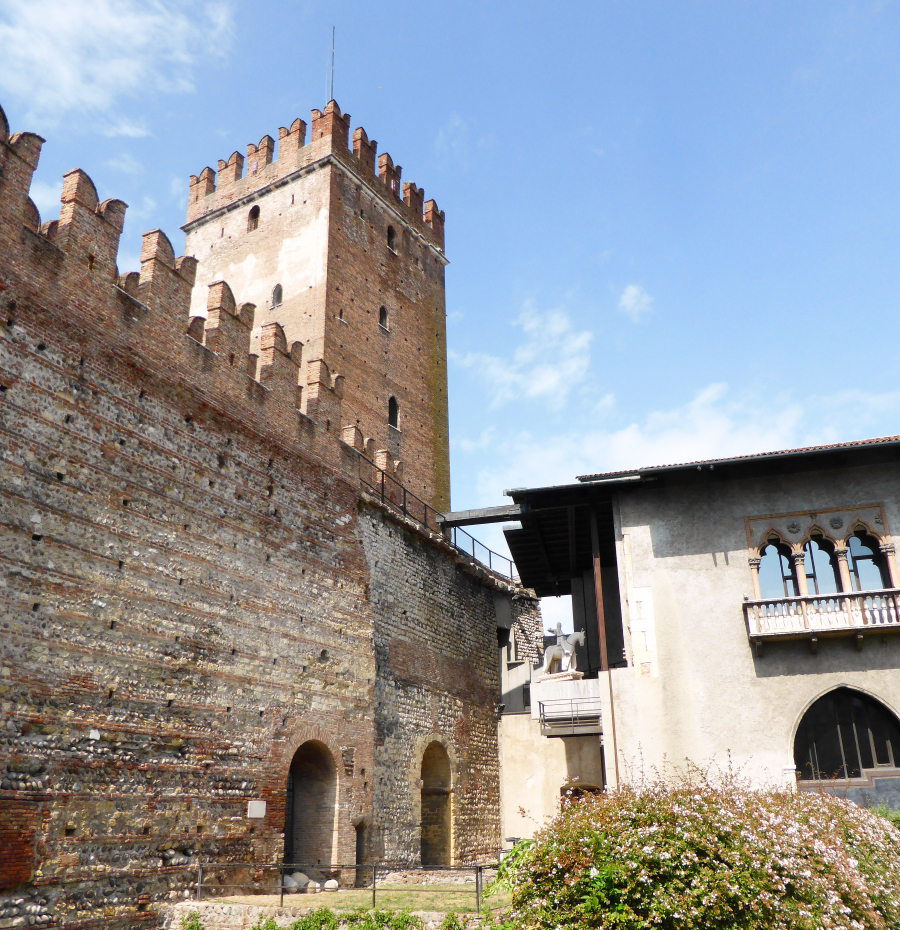 Castelvecchio was a fortress built by the Scaliger dynasty to defend access to the city from over the River Adige. A ‘castellated’ bridge was built over the river as well to welcome the local army’s return before being closed to chasing enemies. One authority claims it was a back door exit for Cangrande I in case his own citizens grew weary of him and he could escape over the river. The whole complex wasn’t finished until the 1350s, well after Cangrande had passed on. The trouble with any defensive system such as castles on river-banks is that they become old technology as well as cold uncomfortable living quarters. Translated, ‘Castelvecchio’ means “Old Castle”, the name change necessitated by the construction of San Pietro Castle on the hill on the other side of Verona 40 years after Castelvecchio was completed. What to do with San Pietro wasn’t a problem for 20th century town planners as it was blown up by French soldiers in 1801. Castlevecchio’s 20th century function was resolved by turning it into an art museum in the 1920s and so today’s tourists get to see both a medieval fortress in good condition as well as a collection of paintings, sculptures, jewellery and arms from the Middle Ages to the 18th century. The combination of Art, Architecture and history makes a visit to Castelvecchio very interesting and we enjoyed our time strolling the galleries, gardens and battlements of this river castle.