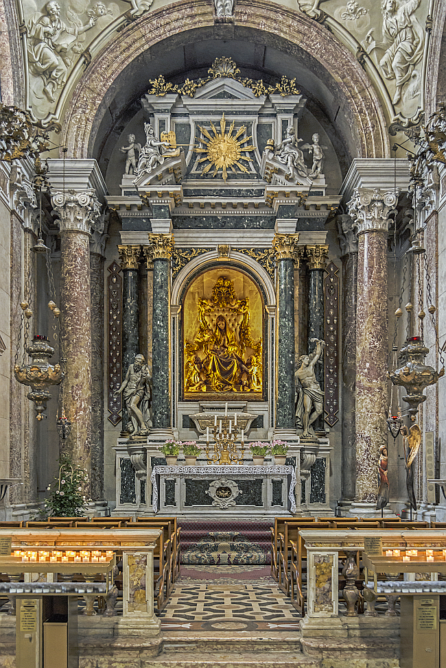 The Duomo is the latest of a number of churches built on this site since Roman times. It has a very beautiful interior but it dates from the 15th century renovation of the cathedral. It has three chapels on each side, the one in the image on the right is of Capella della Madonna del Popolo.