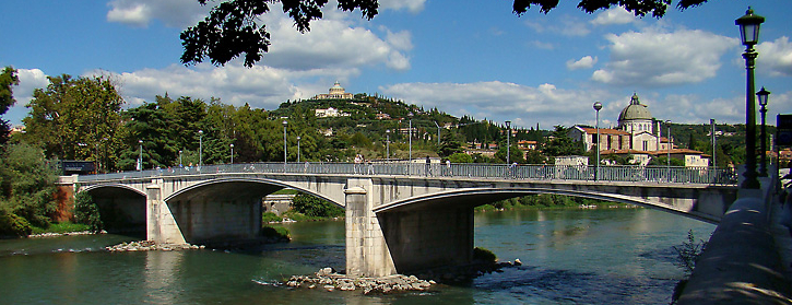 Our plan now was to cross over the river by the Ponte Scaligero bridge and walk down the left side of the river on our way to have look at the Duomo of Verona. It was a beautiful bridge and in its day it was a great engineering achievement, its spans being the longest ever achieved up to that time. Its beauty and its engineering didn’t protect it from the military vandals of the last few centuries. The departing French in 1802 destroyed the Bridge’s tower on the left bank but the departing NAZI troops in 1945 dynamited the whole bridge. What was left can be seen in the image above, left. It was reconstructed between 1949 and 1951.