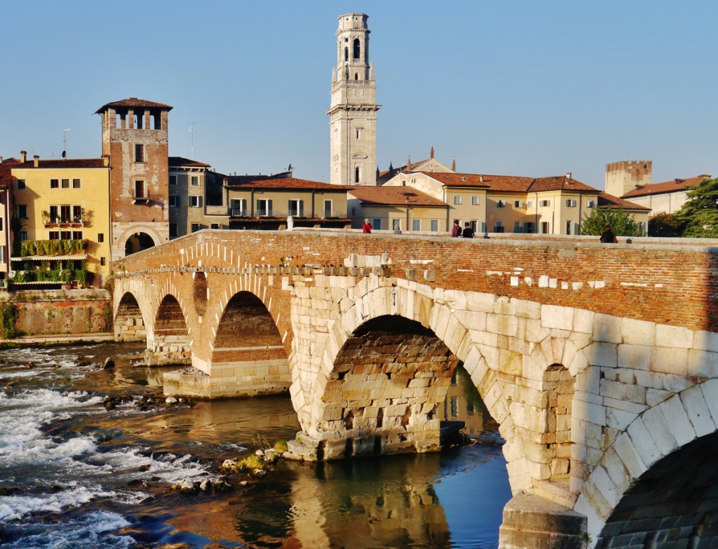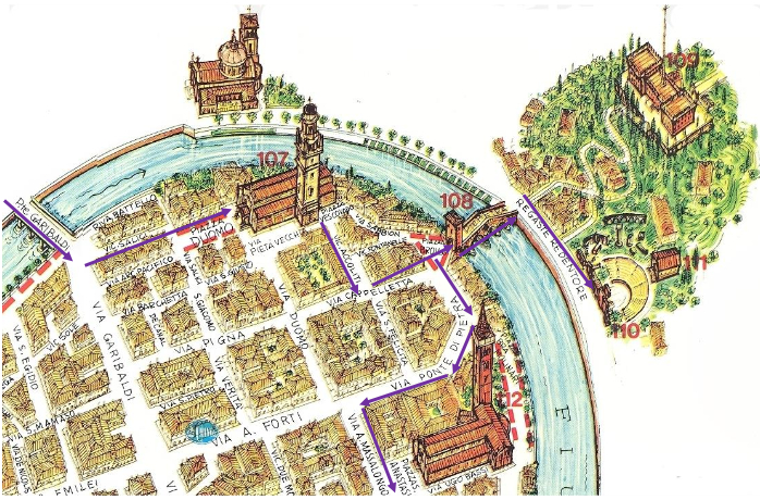 Returning to the earlier map of our Day 2 route, you will be able to see we cut across the apex of the city to the next bend in the river to the Ponte Pietra (Stone Bridge). The story of the infrastructure of Verona is generally about the rebuilding the city’s important facilities and this bridge is the best example. It is a very old bridge (at least parts of it are), being called the Stone Bridge as it replaced the first wooden bridge that crossed the river here in Roman times. It was destroyed several times in the Middle Ages by floods and was rebuilt in its current form in the 1500s. Of course it was another Verona bridge blown up by the departing German Army in 1945. The two central arches are the survivors of the Middle Ages bridge when Ponte Pietra was rebuilt in 1959 after its building blocks were rescued from the river.