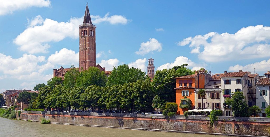 Despite the disappointing end to our first day in Verona when we straggled home very wet from our night at the opera, we were happy to rise early the next morning and get organised for our last opportunity to see the sights of Verona. We only had half a day to see more of fair Verona as we were being collected after lunch for the trip north to the shores of Lake Garda. Our first destination for the day was Castelvecchio, the fortress built on the banks of the Adige River by the della Scala family who ruled Verona and the region for over a 100 years back in the 13/14th century. The map of our journey below shows a dotted line to Piazza S.Zeno which is an imaginary line that we would have liked to have walked if we had plenty of time in our day to see more of Verona. It was built in 967 CE and its crypt might be the site of Romeo and Juliet’s marriage.