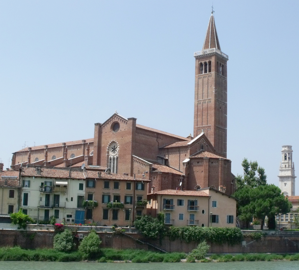 Being reasonably close to Ponte Pietro and the Roman theatre, the area where Saint Anastasia is located is one of the oldest sections of the city. However this church wasn’t started until 1280. Churches of this size take a long time to build so it wasn’t finished until 1400. The bell tower is 72 metres high and is today famed for its bell ringers. As can be seen from the image on the right above, it is a gorgeous church and well worth a longer inspection than the one we were able to give it.
