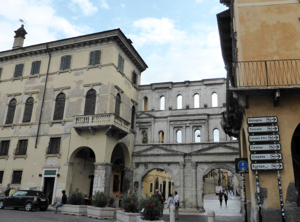 As can be seen on the map of Verona above, the town during Roman times was naturally fortified by the river on three sides and was only open to direct assault on the fourth, south-western side. The medieval walls on the map can be seen enclosing a much larger area of Verona than the original Roman walls that only enclosed the town area just south of the Arena. On our first morning we walked directly down Corso Porta Nuova that led straight to the Arena, starting from the 16th century gate (image right) with the same name. There is an early middle-ages gate, Portini Della Bra (see below), that we passed under that encloses the south side of Piazza Bra which contains both the Roman Arena and the Verona City Hall.