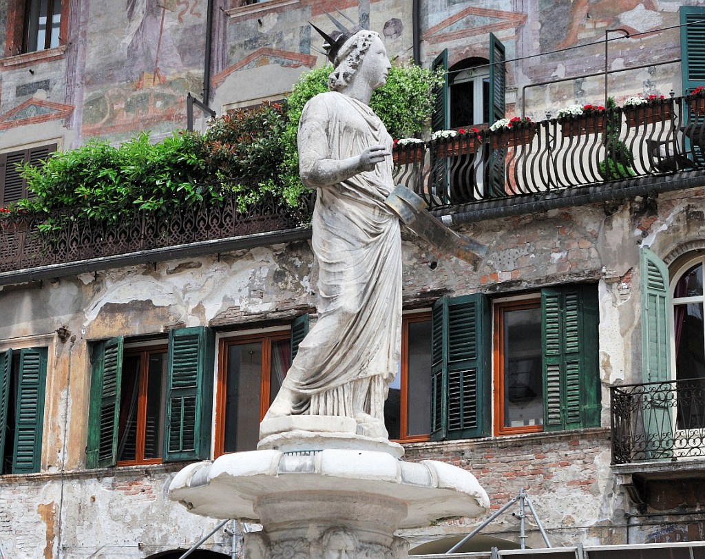 It’s just another short stroll from here down to the next major piazza of Verona, the Piazza delle Erbe. This was the centre of old Roman Verona and under the cobble stones can be found the remnants of the Roman Forum of the first century. Today it is a similarly busy place with a fruit and vegetable market, lots of restaurants and significant monuments from Verona’s past. The first of these is a surviving Roman Column that was used 1500 years after its construction to support a Lion of St Mark, the symbol of Venetian rule over Verona in the 15/16th centuries. The piazza is surrounded by gorgeous palazzos from this period. All fountains in Verona are worth a look but the one at the other end of this piazza is worthy of slow contemplation. The fountain itself is known to have been built around 1368 but the ‘Madonna di Verona’ in the centre is very much older. It is a Roman marble statue that is almost a 1000 years older than the surrounding fountain that survived somehow and was repurposed in the 14th century as the city’s Madonna.
