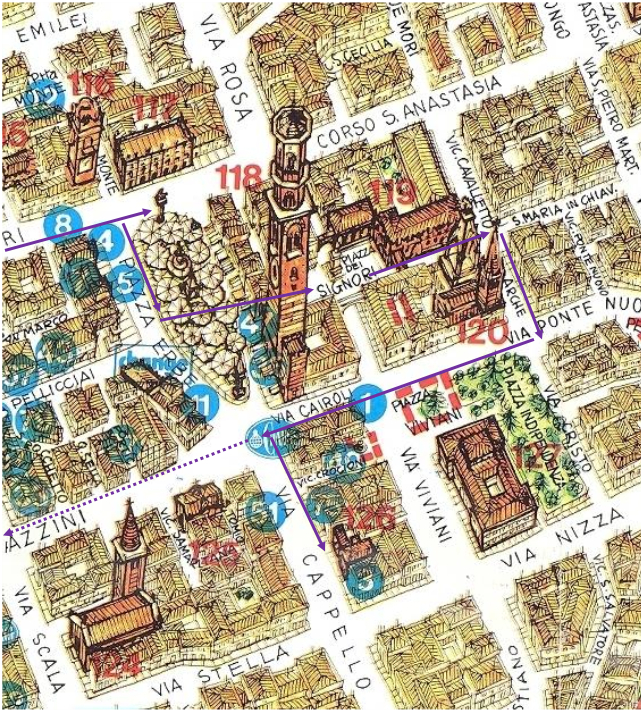 This section of what was once the old Roman section of Verona is packed with palaces and other worthy sights of the city’s long history and so there is a lot to take in. I have seen advertisements for one day tours of Verona and I can’t imagine this would be a satisfactory visit; the pace of getting around would make taking in what you see a blur. This is particularly the case with these two central piazzas, so making sense of the next section after leaving Piazza Signori intensifies this minor touring problem. The map on the left at least illustrates that from this piazza you go through the curiously named Arch of Torture that takes you on to Via S. Maria Antica to the area of the Scaliger Tombs. These are the funerary monuments of the della Scala family who dominated Verona and the wider region for 125 years in the 13/14th centuries. On our touring day tomorrow, we would see a lot more of their monumental legacy when we visited Castelvecchio but the area we were entering was where they left their funerary monuments for the locals to admire for the next 600 years.