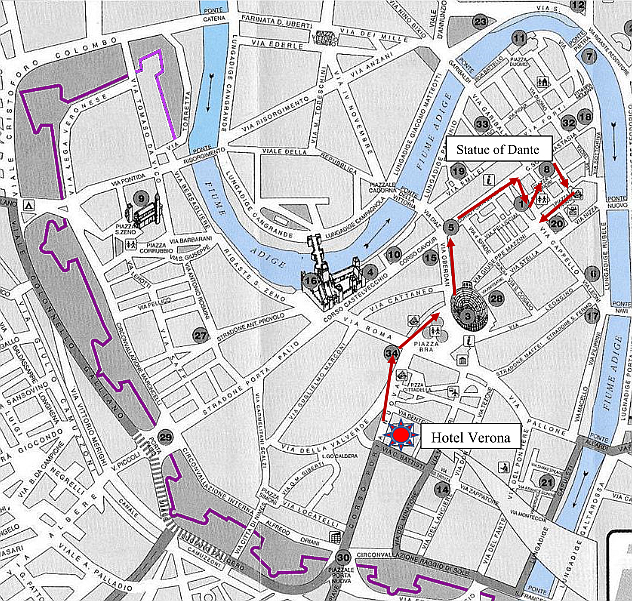 As can be seen above on the plan of Piazza delle Erbe, there is an arched alleyway through to the next area of the city worth inspecting, Piazza dei Signori. If Renaissance Palaces are your thing, this is a great place for a stroll. However, I was more impressed by the statue of the great Italian writer, Dante Alighieri that has stood here since 1865. Dante is famous for many things, particularly for his Divine Comedy which is considered the most important poem of the Middle Ages and the greatest literary work in the Italian language. He spent most of his career in Florence but as an outspoken writer, he became unpopular with the Florentine “powers that be” so he fled to Verona where he spent seven years in exile. He died in Ravenna in 1321 and was buried there but even after his death, his existence was controversial; in 1329, a Church Cardinal wanted his bones dug up and burnt at the stake for heresy. Even as late as the 19th century, Florence wanted their now favourite son’s bones back home but Ravenna refused to co-operate. In 1945, Mussolini wanted Dante’s bones transported to a valley above Lake Garda where he was making his last stand against the allies. Apparently he wanted the greatest symbol of ‘Italianness’ present at fascism’s “heroic” end. So it was with much satisfaction that later on in our trip we visited the Church of Santa Croce in Florence and inspected the beautiful but empty tomb of Dante!